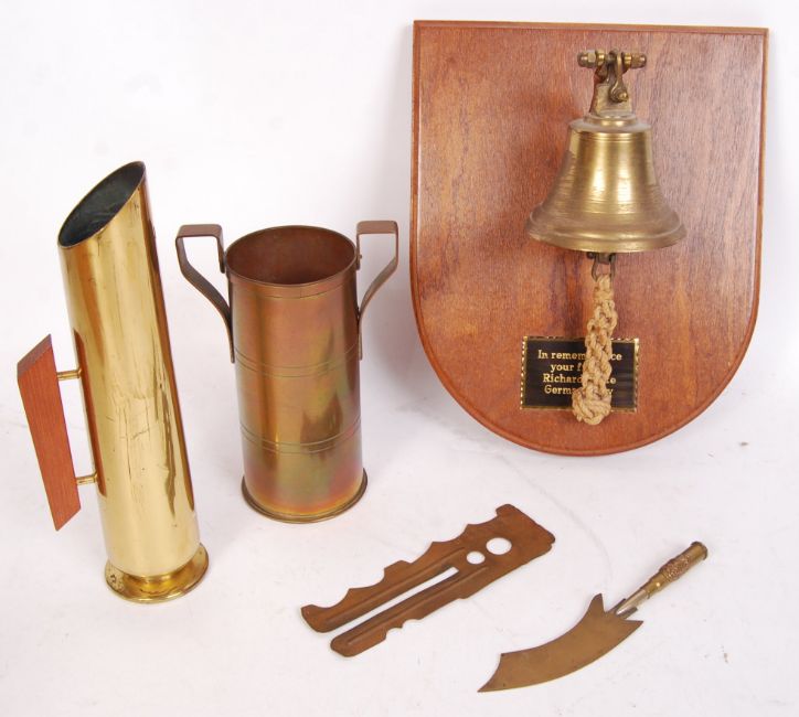 A collection of original WWII Second World War related items comprising; 2x apprentice piece trench art artillery shell vases & bullet handled knife & brass wooden mounted bell with plaque saying "In remembrance your friend Richard Wilke German Navy".