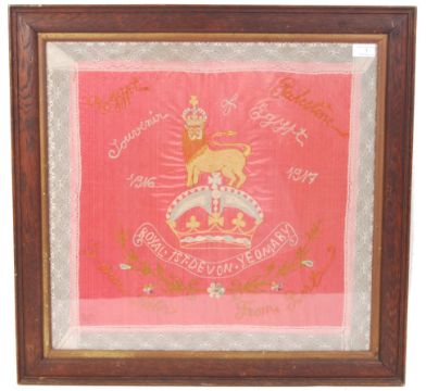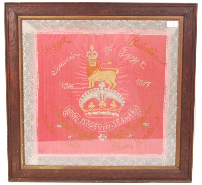 An original WWI First World War period sweethearts silkwork panel, from the Royal 1st Devon Yeomanry. The top with embroidered ' Egypt ' and ' Palestine ', with dates 1916 / 1917. The lower portion reads 'To Dear Sister, From Bert '. Beautifully made, with lace edging. Framed in a period oak frame. Measures approx; 66cm x 68cm (glass broken to one corner).