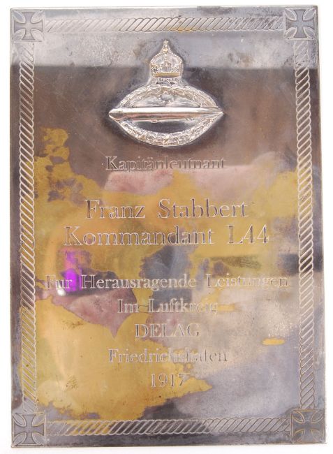 An incredibly rare WWI First World War silver plated Imperial German plaque commemorating Franz Stabbert - Kapitanleutnant of Zeppelin LZ93 (L44) after it's crash in France, 1917. The plaque with makers marks to verso for ' J. Godet & Sohn ' measures 23cm x 16cm, and features an Imperial German Zeppelin badge to the top, and reads ' Franz Stabbert - Kommandant L44 = Fur Herausragende Leistungen Im Luftkreig - DELAG - Friedrichshafen - 1917 '. (For Outstanding Performance In The Air). The border features an Imperial Cross to each corner. Within it's original presentation case. Incredibly rare and interesting piece of history. Note: 'L44' denotes the 'tactical numbering system' of early Zeppelins, it's production number was LZ93. Kapitänleutnant Franz Stabbert was a Kapitänleutnant of the German Kaiserliche Marine. Stabbert was in command of LZ 93 when he took off from Tønder in the night of 19 October 1917 to participate in a so-called silent raid over England with 10 other airships. After completing its mission the LZ 93 set course for Tønder to head home on the morning of 20 October 1917. The ship however came in trouble over France near Chenevières as it was passing a storm. The ship climbed to a height of 6 km in an attempt to outflee the storm, but suddenly the ship was hit by anti aircraft fire from the French army-artillery 174th section of Chenevières and Saint-Clément southeast of Luneville in the department of Meurthe-et-Moselle and the region Lorraine. After being hit, the ship caught fire and ultimately the hydrogen filled gas cells exploded before plunging nearly completely vertical to the untouched French soil below. The LZ 93 was photographed during its fall to Earth and the pictures were published in the weekly Le Miroir on 4 November 1917. All crew onboard the airship perished in the disaster and the body of commander Stabbert can be seen next to his ship on the picture taken from the wreck. It is believed that the crew died when they were crushed by the zeppelin when it smashed into the ground, suggesting that the crew was fully aware of their 6 km long descent. The crew were all buried in the city of Gerbéviller. Four other zeppelins who had accompanied LZ 93 on its raid were also shot down above France.