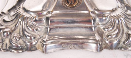 A pair of mid 20th century silver plated candlesticks - with foliate bases. Each carries the logo for the Third Reich German ' SS ' Schutzstaffel ' division. SS to front, and Eagle / Swastika to verso. Each measures approx; 13cm tall. NOTE: From a private collection of German militaria comprising of both genuine and replica items. Where possible we have stated ‘original’ or ‘replica’ but buyers are strictly reminded to satisfy themselves prior to bidding as to authenticity / condition irrespective of the description.