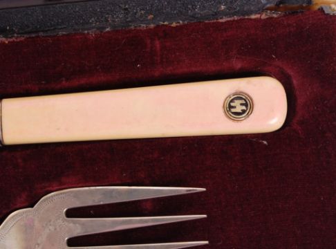 A 20th century WWII style German Third Reich Nazi ' Waffen SS ' assigned carving set. The large knife and fork with horn handles inset with the 'SS' emblem, and an SS stamp to the inner box lining. Boxed.  NOTE: From a private collection of German militaria comprising of both genuine and replica items. Where possible we have stated ‘original’ or ‘replica’ but buyers are strictly reminded to satisfy themselves prior to bidding as to authenticity / condition irrespective of the description.