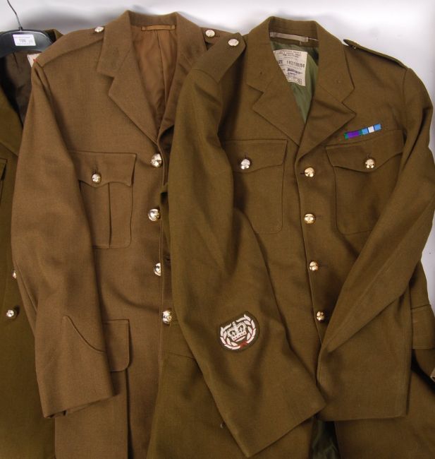 A collection of 4x contemporary 20th century British Army & related uniform jackets to include; uniform jacket with brass anchor buttons, medium ladies artillery officers jacket, Khaki green Dewhurst uniform trousers, 1980 pattern dress jacket with ribbon bar & an Artillery NCO dress uniform jacket. All various sizes.