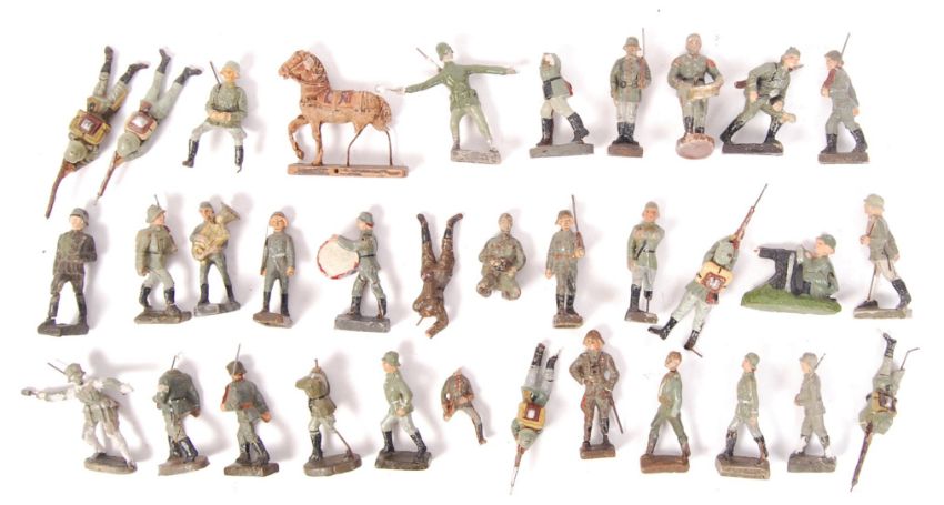 A large collection (x30+) assorted antique pre-war WWII Second World War German ' Elastolin ' and ' Lionel ' model soldier figures. Comprising of infantry troops, machine gunners, bandsmen and various other poses. Some AF. Condition varies. All stamped to base with makers marks. Rare collection.