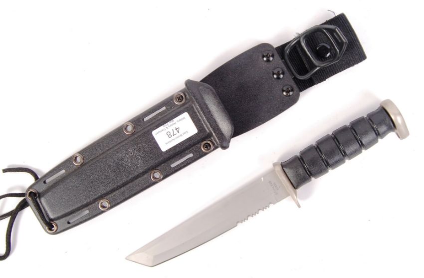 A 20th century contemporary combat / survival knife. No makers marks, but blade etched for ' Stainless Steel '. Double edged - with serrated section. Within the original plastic scabbard. Very good condition.
