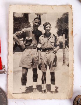 An original WWII Second World War medal group belonging to a Phillip Davey . Comprising of his War Medal, Defence Medal, Italy Star, Africa Star (with 1st Army bar), and 39-45 Star. All with ribbons, on bar. Also included with the lot is a small photograph showing Davey and comrade, his identification tags, various cap badges, a Sweetheart type brooch (with photograph of Davey) and his military issue pocket watch (AF). Good collection. Consigned directly from the family.  LATE ADDITION: 20:33 15/3/18: The vendor has also found Davey's miniature medals which have now been added to this lot.