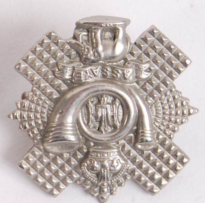 Three original WWI First World War British Highland Light Infantry City of Glasgow uniform cap badge. Two smaller, with one larger.