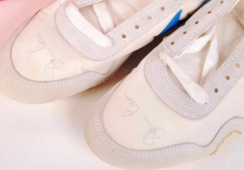 A pair of vintage 1980's Nike running trainers, within the original box, autographed by 1980's Olympic runner Steve Cram - ' The Jarrow Arrow .' Likely won during a charity event of the period. Each trainer is signed by Cram in blue ink to the toe. Supplied within their original box, with unused studs.