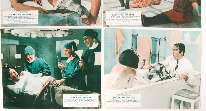 A rare full set of ' Carry On Doctor ' (1968 - starring Sid James, Kenneth Williams, Jim Dale etc) cinema lobby cards. All colour, all 8x10" in size. Each card depicting a different scene from the film. Generally mint condition.