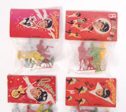 A full set of rare vintage Emirober made ' The Beatles ' ' Beatlemania ' plastic figures. All 4x versions present. Each Beatle depicted in a different colour plastic. Sealed, unopened. Rare.