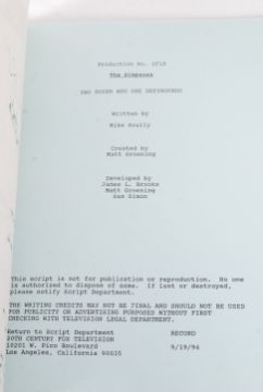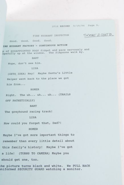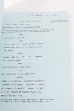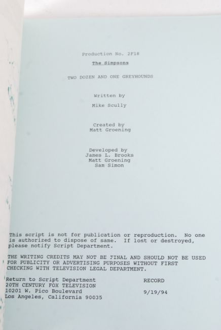 A superb rare original production script from an episode of The Simpsons ' No.2F18 - Two Dozen And One Greyhounds .' Signed to the front by the entire voice cast for the show, and its creator Matt Groening. All have added quotes or character names. The script comes signed by: Matt Groening (with sketch of Bart & Lisa), Yeardley Smith, Harry Shearer, Nancy Cartwright, Hank Azaria, and Dan Castellaneta. All signed in green ink to clear portions. Rare script.