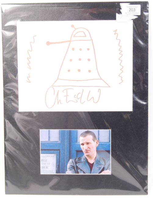 A rare Doctor Who / Dr Who related matted presentation, comprising of a hand-drawn and signed sketch of a Dalek by Christopher Eccleston (Dr Who 2005). Drawn in gold Sharpie, the sketch has been signed by Eccleston to the base. Mounted above a photograph of Eccleston as The Doctor. Measures: 41cm x 31cm.