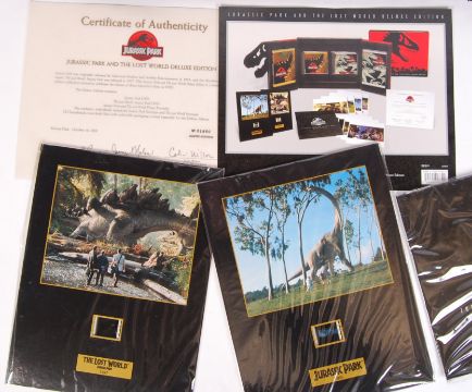 A limited edition Jurassic Park and The Lost World collectors deluxe edition DVD boxed set along with exclusive numbered Jurassic Park & The Lost World senitypes, CD soundtracks & collectable stills. Inner contents mint, with some contents sealed. Within presentation case. No.01850.