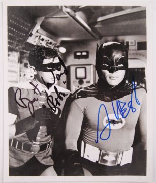 A vintage black and white 8x10" photograph from the original Batman 1960's TV Series. Signed by the two stars Adam West & Burt Ward. Ward adding ' Robin ' after his signature. Obtained in person by the vendor. Rare.