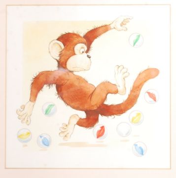 A collection of three charming Peter Stevenson original children's book artwork illustrations from ' Magic Monkey ' by Neil Morris, c1990. Depicting three pages of artwork (from pages 9, 3 and 23). Watercolour, pencil and ink. Two signed to the lower margin in pencil by the artist. All professionally framed and glazed to a total size of 36cm x 86cm. Supplied with a copy of the original book.