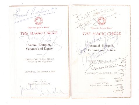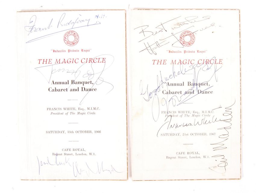Two rare vintage ' The Magic Circle ' Annual Banquet menus / programmes for 1966 and 1967. Each signed by those in attendance. The 1966 menu being signed by Tommy Cooper and Hugh Lloyd (among others), and the 1967 menu being signed by Hattie Jacques, Rowena Vincent and others. All autographs undedicated.  Rare.