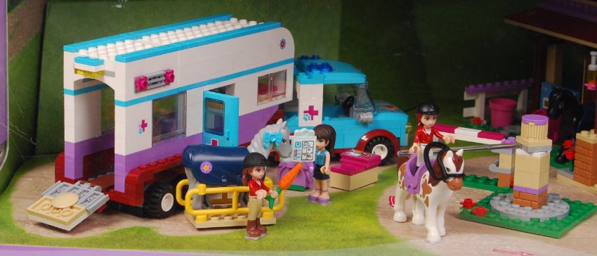 A Lego point of sale shop display advertising cabinet for Lego Friends. Featuring sets 41125 Horse Vet & Trailer, 41123 Foal's Washing Station and 41126 Heartlake Riding Club. Fully made and assembled for display. The cabinet with lights in fully working order. Measures approx; 39cm x 59cm x 38cm.
