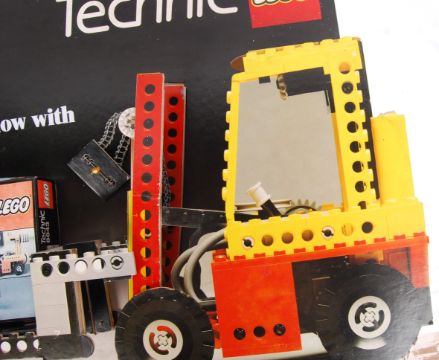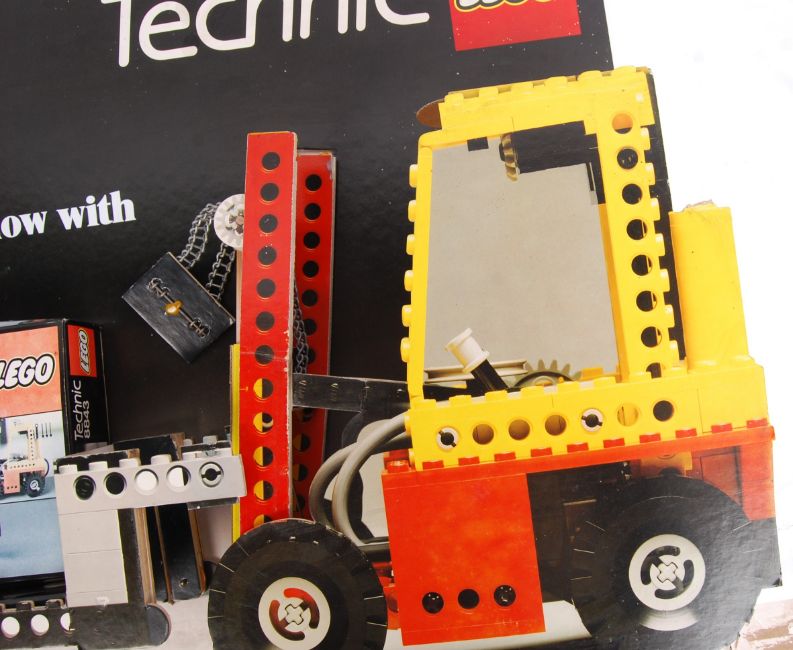 A rare original 1980's (1984) Lego Technic point of sale shop display motorised sign for set 8843 ' Fork Lift Truck .' Cardboard and wood construction, and featuring a full size dummy box of the set. AF (needs putting back together) but all parts do appear present. Measures approx; 60cm x 90cm. Rare.