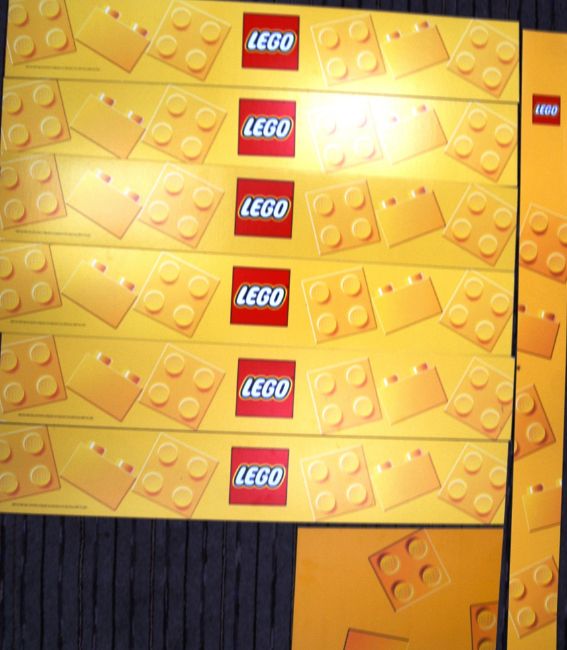 A collection of 6x Lego shop point of sale advertising card display banners having the yellow background and yellow brick design with central Lego logo alongside. Measures 20cm x 118cm..