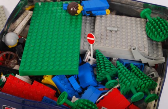 A small collection of assorted vintage loose Lego - comprising of a small tin (approx; 1.5kg), a selection of approx 15x vintage 1980's Knights / Town minifigures, and 7x large vintage base plates / road ways. Good assortment.