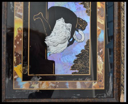 A pair of vintage butterfly wings pictures along with a tray of similar design and form. The tray having marquetry inlay with landscapes scenes. 71cm