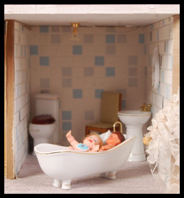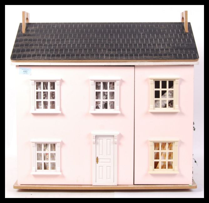 A large Victorian style five room detached dolls house / mansion, complete with a quantity of related Victorian style furniture. With detachable fronted mock titled roof. Electric lights fitted and in fully working order (plug removed for selling). Measures 65cm x 60cm x 30cm.