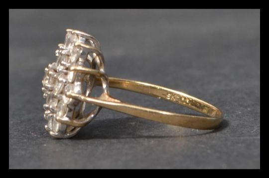 A 9ct gold and white stone cluster ring. Remnants of a Sheffield hallmark. Tests 9ct gold. Weight 2.3g. Size L.