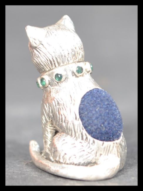 A sterling silver pin cushion pincushion in the form of a cat having inset ruby eyes in the manner of Adie and Lovekin. Weighs 14 grams.