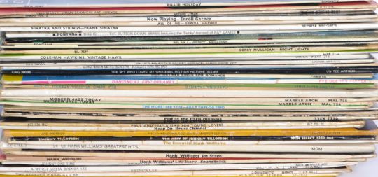 A collection of long play LP vinyl record albums featuring many different artists and genres to include Gerry Mulligan, Bob James, Sinatra, Erroll Garner, Billie Holiday, Caterina Valente and many many more