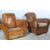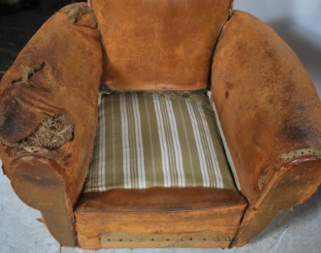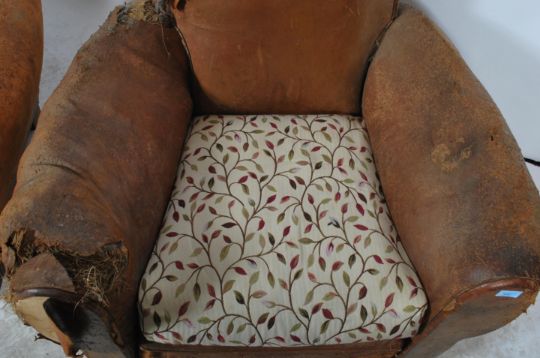 A pair of 1920's rustic French Art Deco leather club / easy / lounge armchairs. The vintage chairs being wooden framed with stuffed horse hair and upholstered in full grain leather in a distressed fashion originally having barrel rolled arms and raised on stub stile legs.