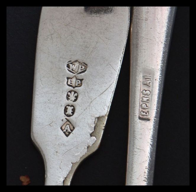A pair of silver hallmarked Walker and Hall sugar nips / tongs together with a collection of silver plated flatware to include cased examples. Measures 16.5 cm long.
