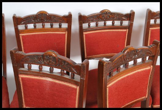 A set of 6 late Victorian mahogany dining chairs being raised on turned legs with overstuffed seats and back rests, all with spindle gallery turned top rails. Measures: 90cm high x 45cm wide x 49cm deep.