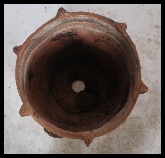 A 19th century Victorian terracotta planter having raspberry prunts. Orange pottery construction , of bulbous form.