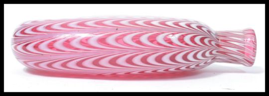 A Victorian 19th century Nailsea glass flat oval bottle in cranberry with white spiralling twist trails. The bottle of oval flat torpedo style. Measures 18 cm high and 9.5 cm wide.