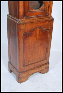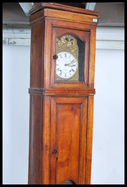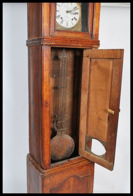 A 19th century French longcase / comptoise grandfather clock. The white enamel dial signed fpor L Goron a' A Sanze having stunning stamped brass spandrels and the arch embossed with a decorative scenes. Set within a fruitwood case having glass pendulum window