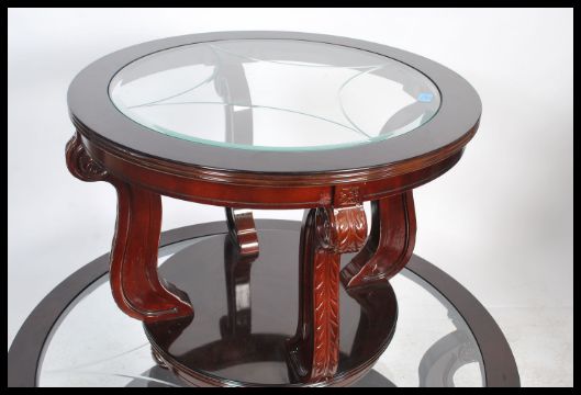 A pair of 20th century Chinese hard wood circular coffee tables, drop in central glass panels raised on shaped supports. 48x102 diameter