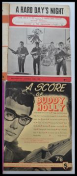A collection of vintage 20th century popular culture sheet music to include The Beatles - I'll Get You, A Hard Day's Night, Thank You Girl, The Fabulous Beatles Souvenir Song Album, The Beatles Souvenir Film and Song Album A Hard Day's Night, A Score Of Buddy Holly, The Elvis Presley Album Of Juke Box Favorites and Four Great Songs Recorded by Elvis Presley on RCA Victor. Highest measures 30.5 cm.