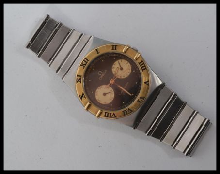 An 18ct gold and stainless steel cased Omega Constellation watch. Black signed dial with gilt dot numerals and faceted hands. Day and date apertures present with 18ct gold Roman numeral chapter ring to the outer case. Set to a stainless steel Omega strap with Constellation pictorial back. Omega crown winder present.