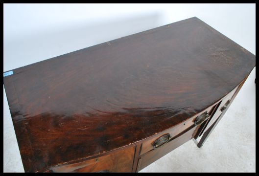 A Georgian early 19th century mahogany bow fronted  sideboard of small proportions being fitted with cupboards and drawer flanking a central arched recess. All  raised on square tapered legs with spade feet. 87x106x53