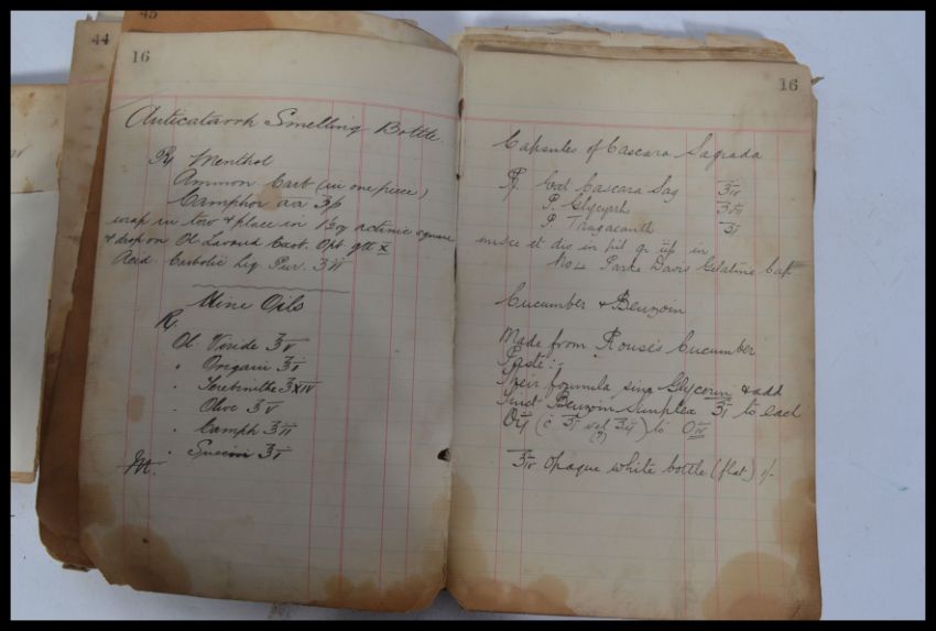Two antique c1910 Edwardian recipe books. The first dated 1911 written by an ' HR Thurgar ' (?) which includes recipes for such things as ' Furniture Cream,' 'Worm Powder For Dogs,' 'Digestion Mixture,' and various others (part filled). Along with an earlier but much heavier worn recipe book - which contains various similar recipes. Interesting items. Harry Thurgar was an apprentice chemist from Braintree.