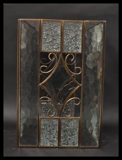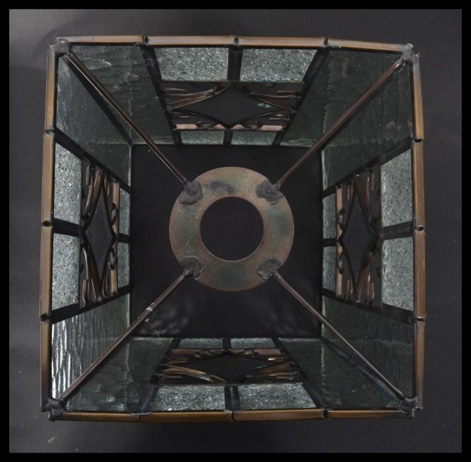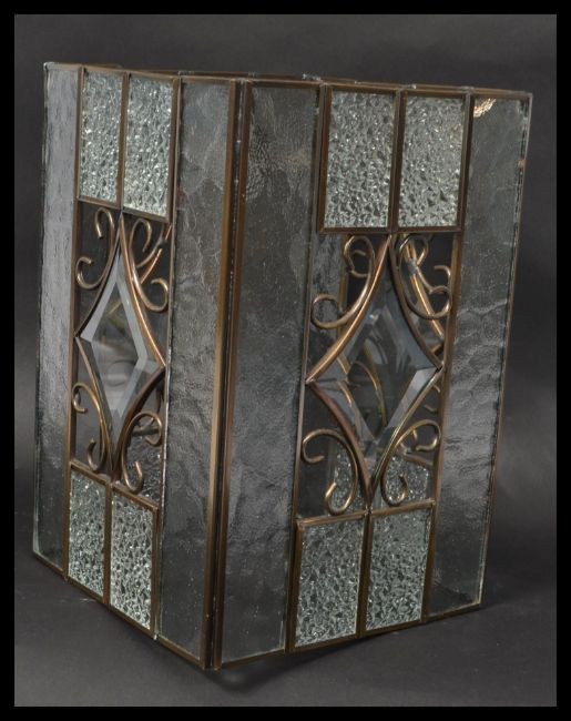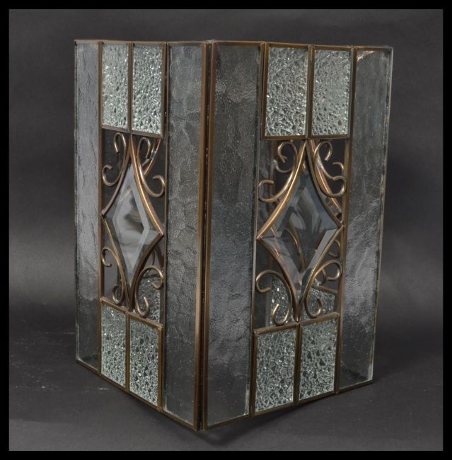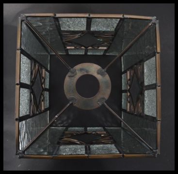 An early 20th century glass porch lantern of rectangular form having frosted glass panels with faceted diamond panels. 23x16x16