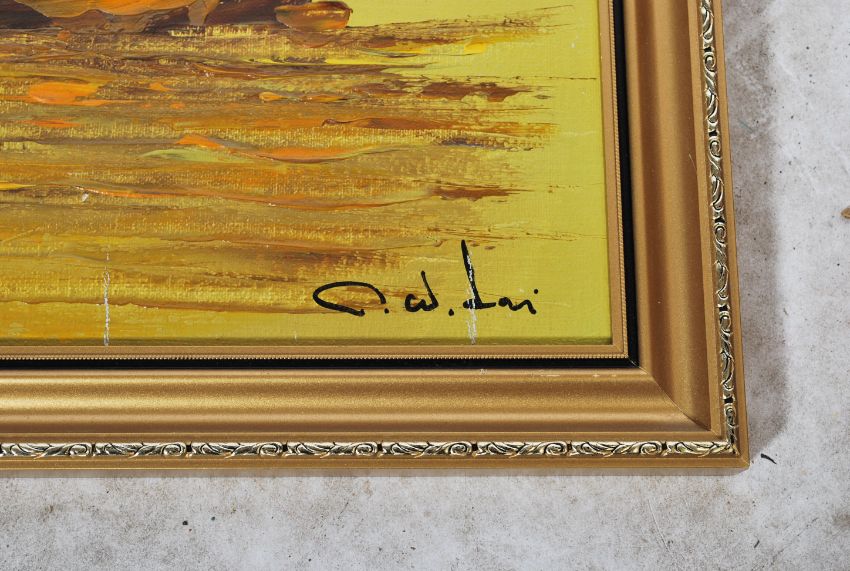 A vintage 20th century oil on board painting of a Hong Kong Junk boat ship signed to lower corner. Frames.