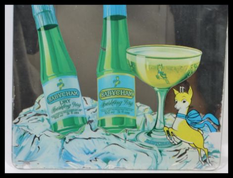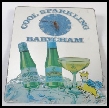 A vintage mid 20th century retro 1960's Babycham advertising point of sale breweriania pub bar display mirror clock of rectangular form. Measures 43 cm high and 30 cm wide.