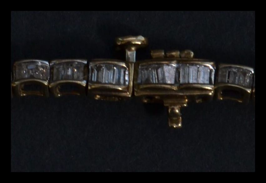 A hallmarked 9ct gold and diamond bracelet being set with baguette and trapezoid cut diamonds stones in a channel link setting. Hallmarked Birmingham. Diamonds approx 2.1cts. Measures 7.5 inches. Weight 8g