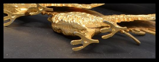 A pair of early 20th century brass gilt brace of pheasants with inset red glass eyes. Measures 11.5 cm high, 14 cm wide and 25 cm deep.