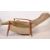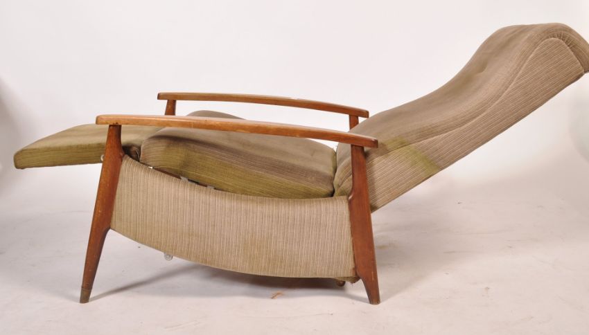 A mid century retro armchair having show wood frame with reclining action and upholstered in a beige corduroy type fabric