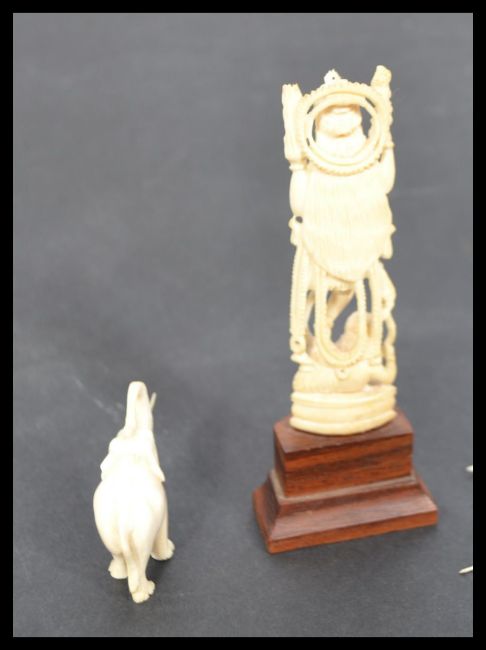 A group of 19th century European and Asian ivory to include two hair pins , elephant figurine , Buddha / deity on wooden base and a letter knife. Please see images.