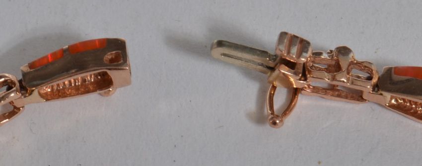 A 14ct gold demi-parure set consisting of necklace , bracelet , ring , earrings all having fire opal panels.