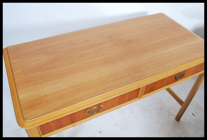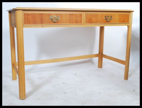 A contemporary 20th Century console table, two drawers to the front raised on reeded supports united by a central stretcher. 75x120x58