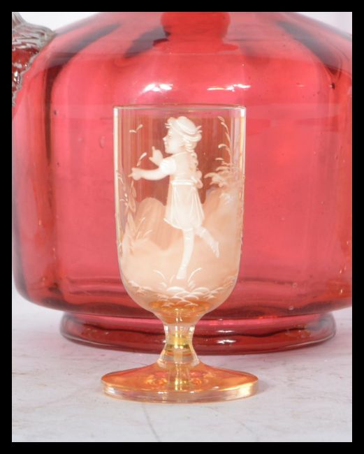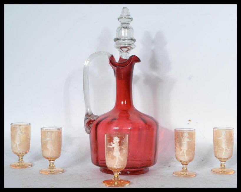 A set of five 19th century Victorian Mary Gregory orange liqueur glasses along with a similar period cranberry glass decanter. Please see images. Highest measures 28 cm.