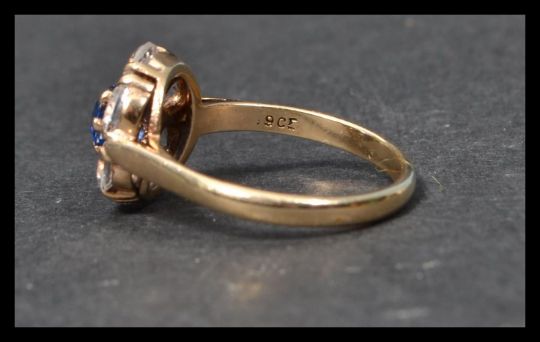 A 9ct gold cluster ring set with a central round brilliant cut stone surrounded by a halo of white stones. Marked 9ct tests 9ct gold. Weight 3g. Size N.